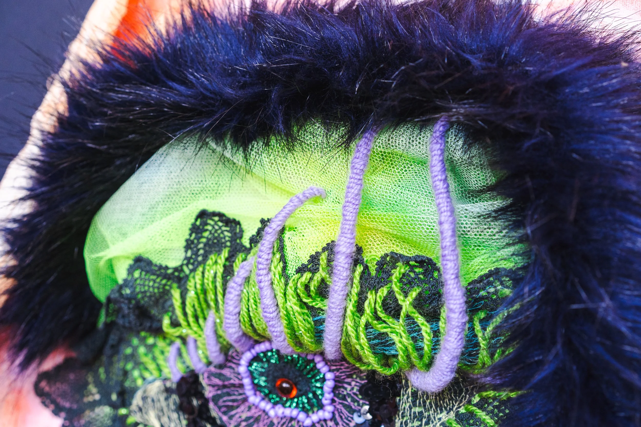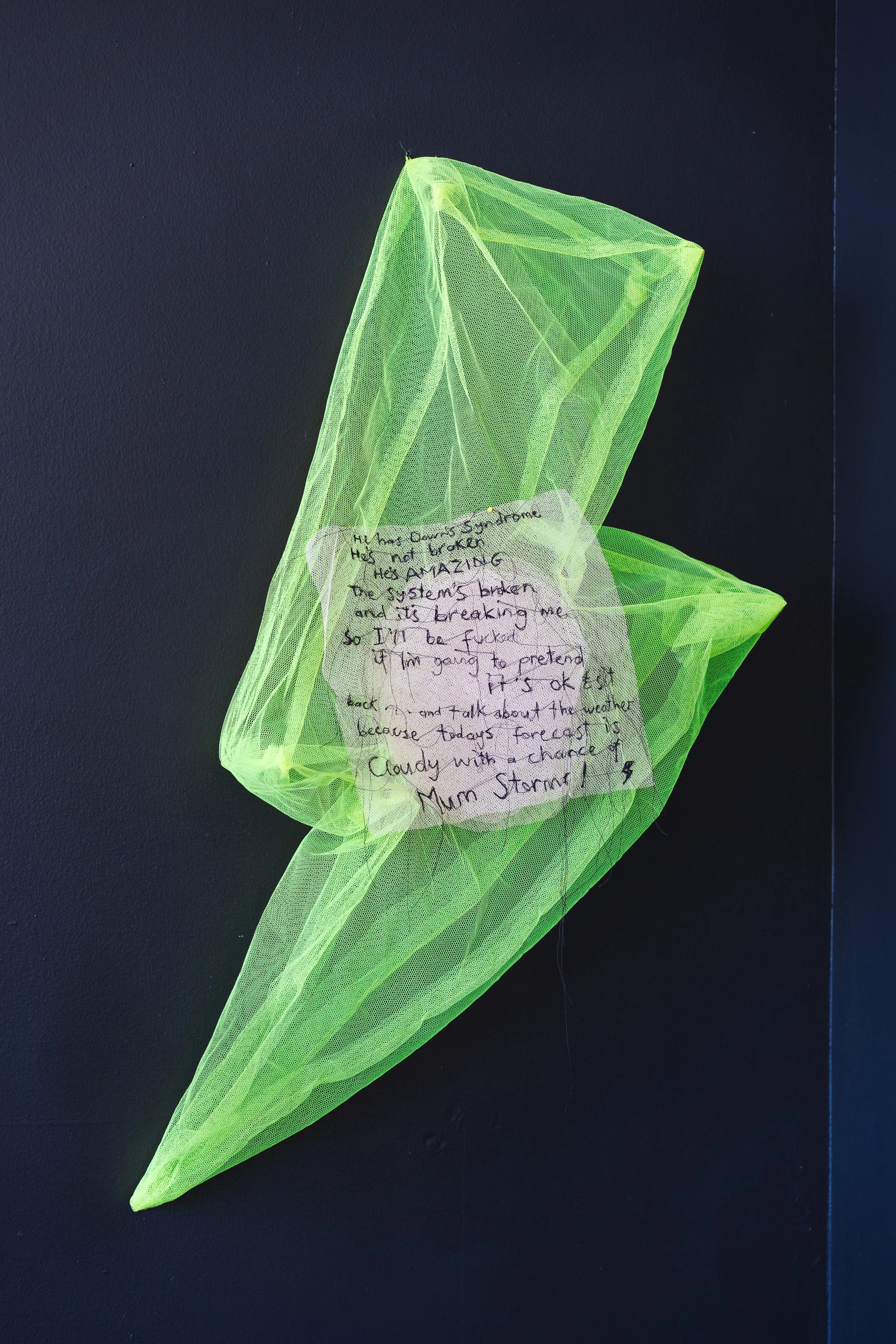 Often referring to herself as a “brewing storm”, Emma is both emboldened and exhausted by her “advocacy against the ludicrous” to protect her family. As a form of release, she tackles overwhelming expectations and depressive seriousness with humour and a freedom of imagination that’s so often beaten out of us by demands to conform to a linear cognitive framework. Stitch by stitch she prods at societal judgments, to dissolve stigmas of brokenness about people, as she says, “who think outside the box and never seem to fit in the square”.